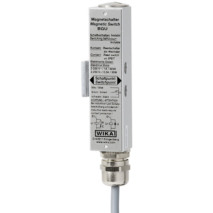 BGU型式磁性開關(guān)用于磁翻柱式液位計(jì)的液位高度限位檢測(cè)。開關(guān)動(dòng)作時(shí)產(chǎn)生一個(gè)二進(jìn)制信號(hào),供給下游電路使用或控制設(shè)備。雙穩(wěn)態(tài)磁性開關(guān)可保持住信號(hào)。